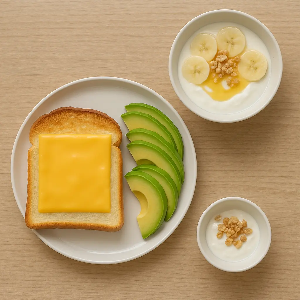 치즈토스트 하나, 아보카도 몇 조각, 요거트 한 컵.