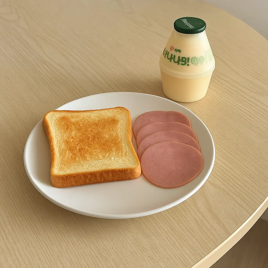 빠듯한 아침, 조리 시간은 7분이면 충분해요. 토스트 한 장에 햄 한 조각, 바나나우유 한 병. 이 소박한 구성만으로도 하루를 차분히 시작할 수 있어요.