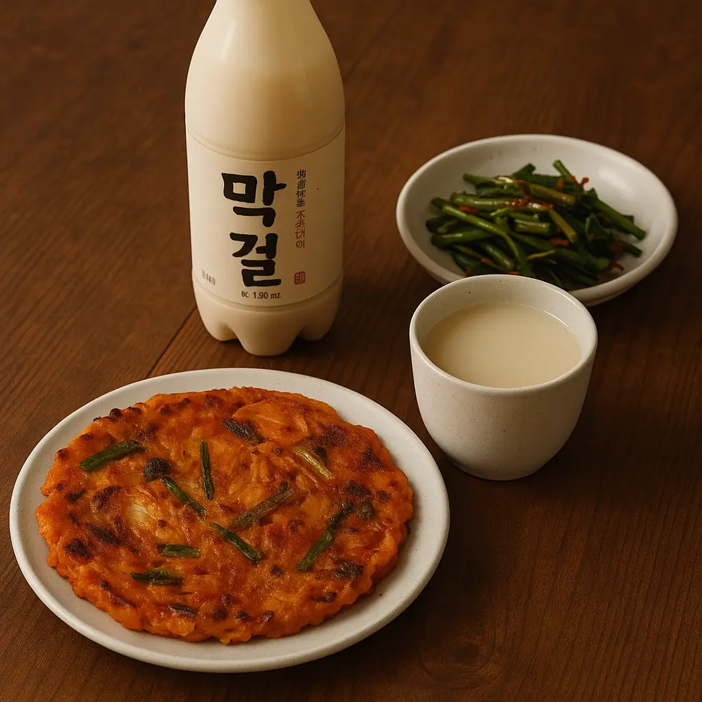 비 오는 날엔 이 조합! 바삭한 김치전에 시원한 막걸리 한 잔이면 자취방도 금세 분위기 충만. 재료 간단, 만족도 높은 감성 저녁 한상입니다.